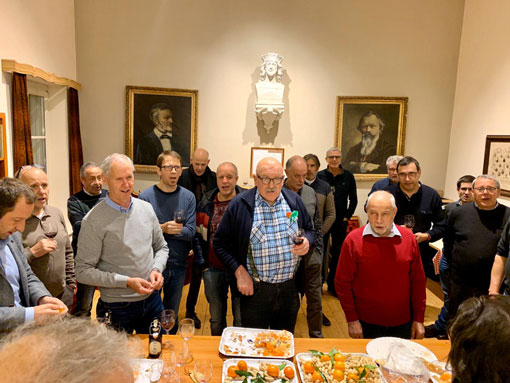 Ein altgedienter Sänger hört auf5. Juni 2019 ••• Paul Lanz (Jahrgang 1936) hat schweren Herzens bekanntgegeben, dass er nicht mehr Sänger des MGV sein kann. Nach der Übergabe eines Erinnerungsdiploms und einer guten Flasche Wein durch den Obmann bedankte er sich bei allen Sängern und unterstrich, wie wertvoll der Verein war, speziell als seine Frau verstarb und er Halt brauchte. Anschließend lud er zum »Gianni«, bei Bier und Häppchen sowie einigen Liedern wurde noch lange geredet und in Erinnerungen geschwelgt.